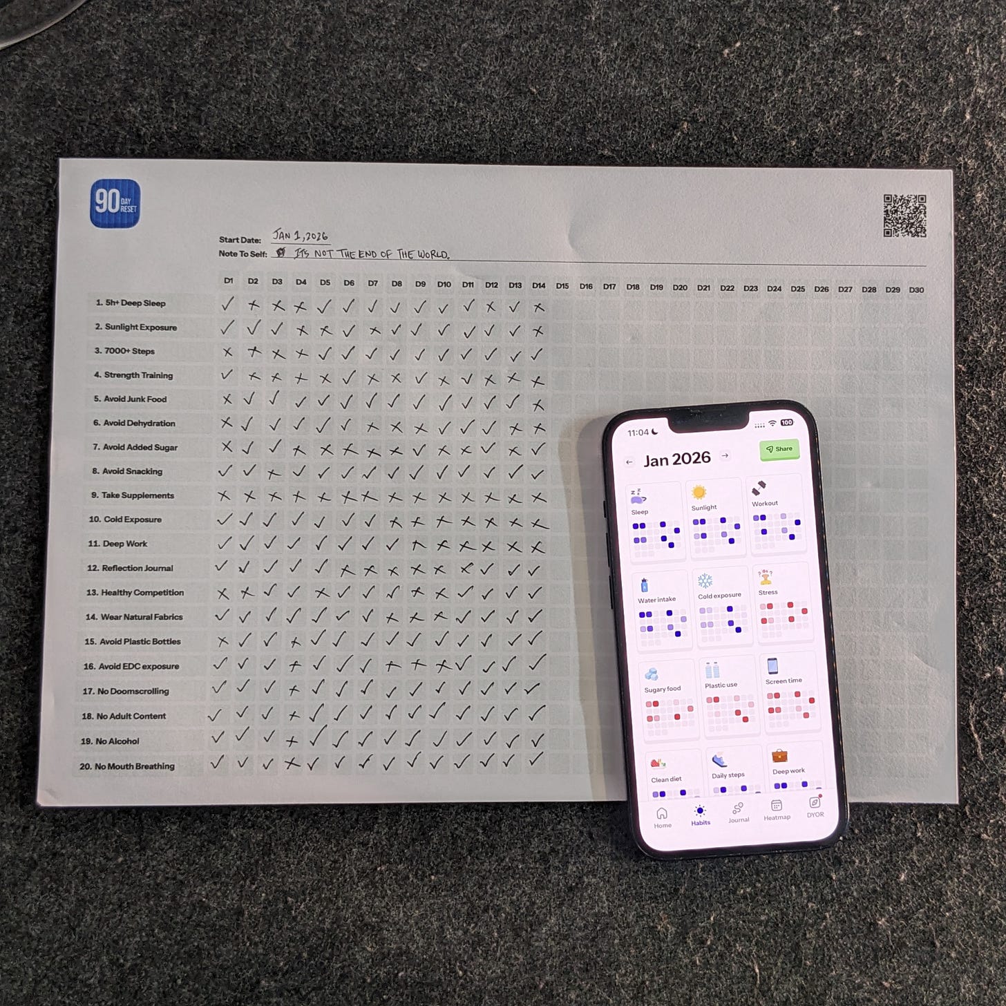 Download the 90 Day Reset app & start your reset journey. Track sleep, sunlight, nutrition, movement & stress management across 90 days. One heatmap. Zero noise.